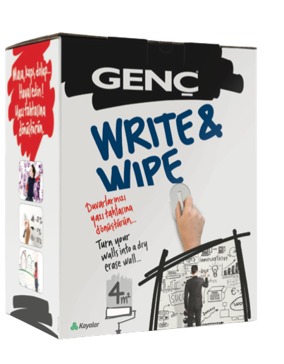 Genç Write&Wipe — это модифицированная акрилово-уретановая двухкомпонентная прозрачная краска на водной основе, предназначенная для создания эффекта белой доски на ранее окрашенных или загерметизированных поверхностях. После высыхания на нем можно рисовать или писать рекомендуемым сухостираемым маркером, который затем можно стереть рекомендованным ластиком. Легкое нанесение и минимальный запах делают его пригодным для использования внутри помещений. Genç Write&Wipe идеально подходит для деревянных поверхностей, а также для старых и новых окрашенных поверхностей (не подходит для необработанных поверхностей).